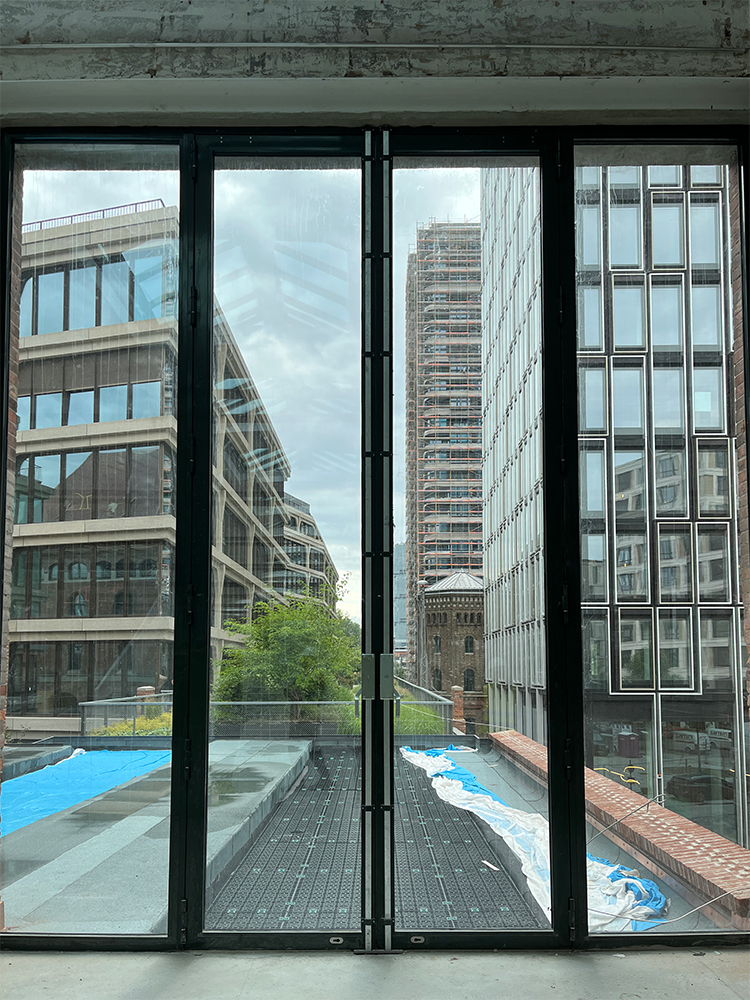 Innenansicht eines Musterbüros mit Glasfront und Loft-Atmosphäre